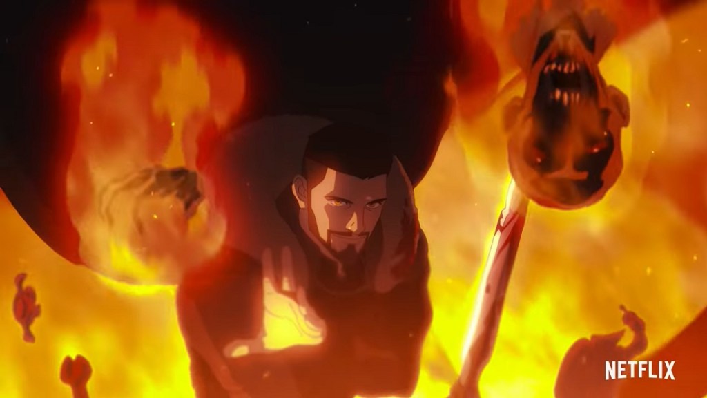 La animación tengo que decir que me recordó un poco a la de Castlevania y que no reparan en los litros de sangre y las partes que salen volando cada que alguien mata a un monstruo o a otra persona, aunque se ven menos acartonadas las peleas, eso es de lo poco bueno de esta película.